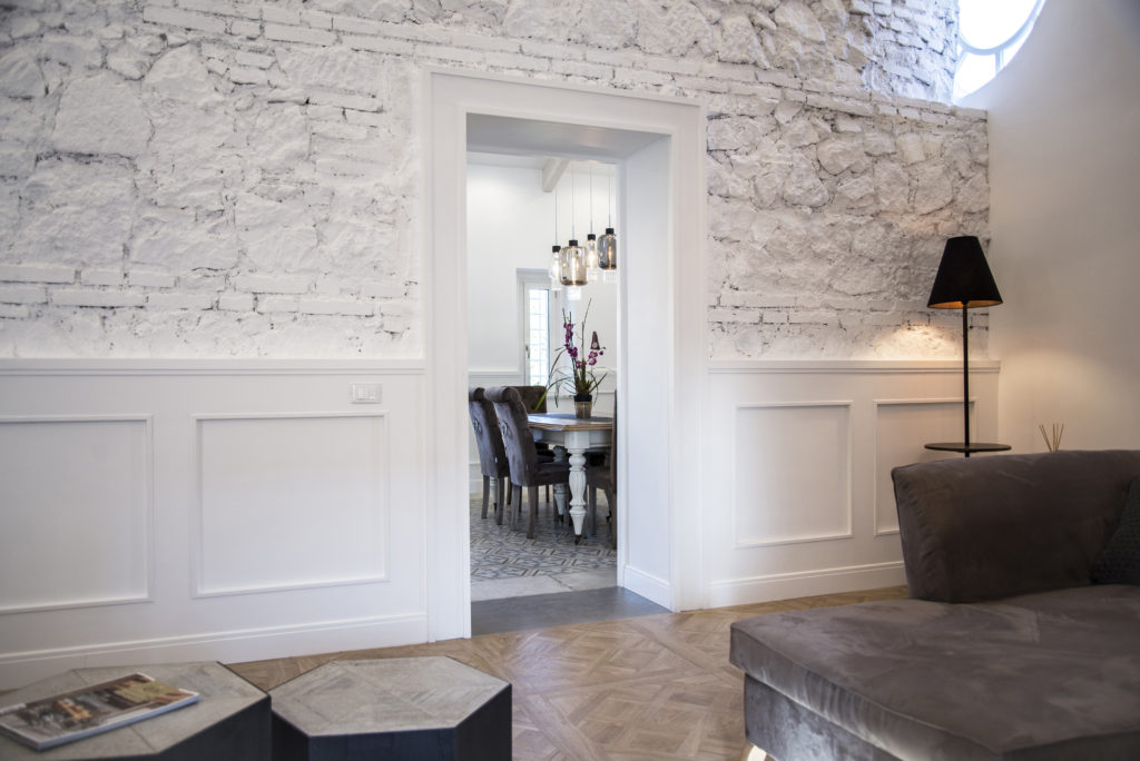 Gli ambienti principali dell’immobile sono caratterizzati da soffitti alti ed inclinati e dalla presenza di travi in legno a vista riscoperte dopo le demolizioni dei vecchi controsoffitti; dal muro di spina principale, che attraversa longitudinalmente tutto il corpo di fabbrica, è stato rimosso completamente il vecchio intonaco per lasciare a vista una muratura mista in pietra e ricorsi di laterizi; sul lato corto del fabbricato è stato riscoperto un rosone precedentemente murato che consente l’ingresso negli ambienti di un cono di luce sia di giorno che al crepuscolo che con il chiarore della luna.