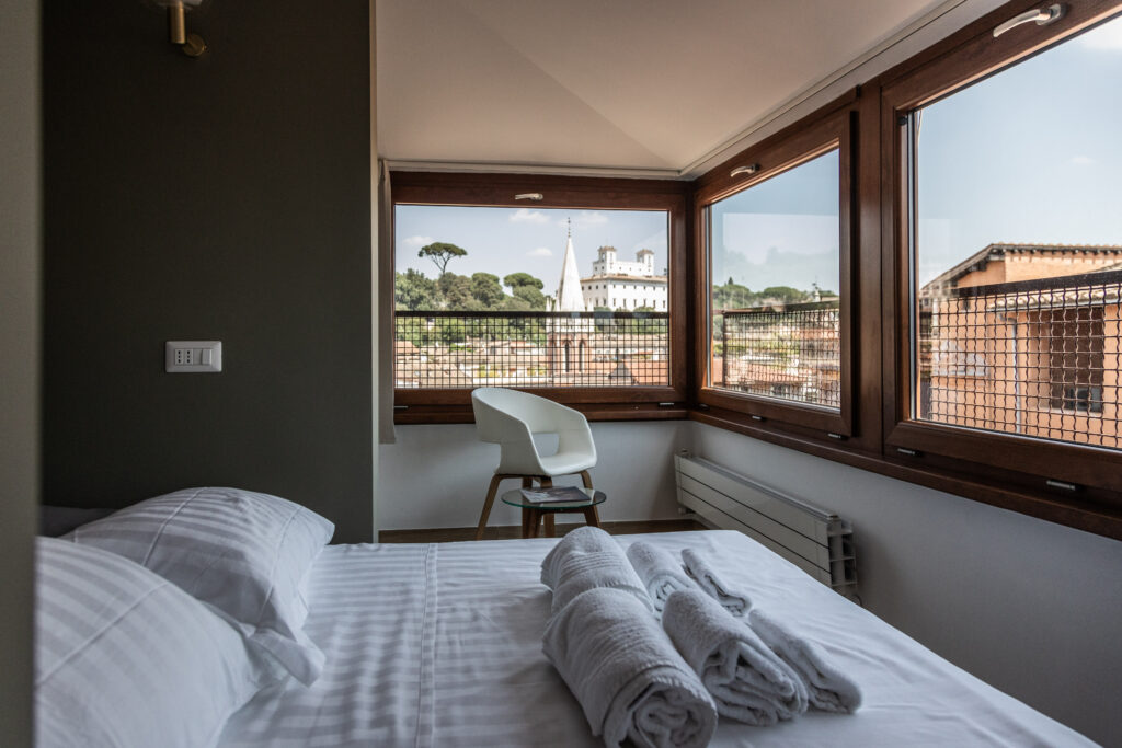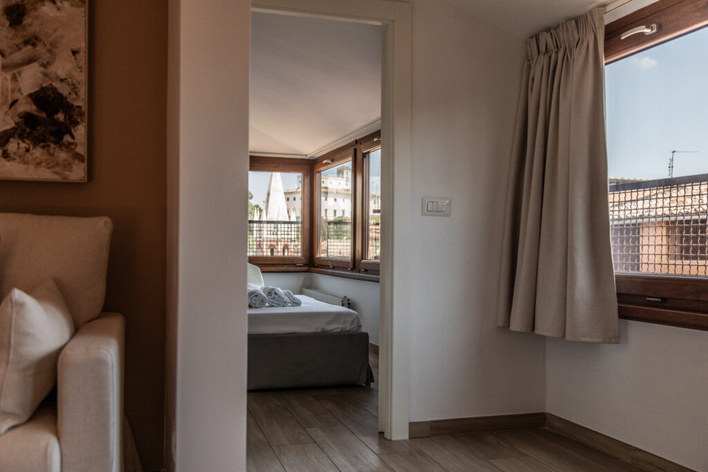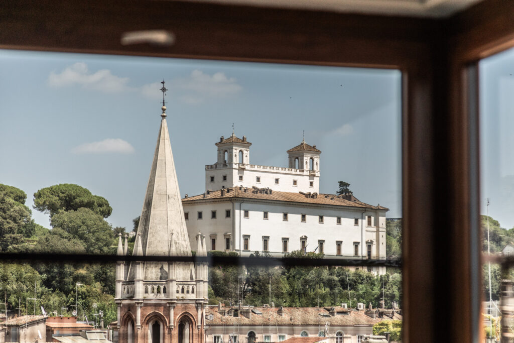 Dalla zona giorno si accede alla camera da letto, un nido intimo proiettato verso l’orizzonte. Le ampie vetrate angolari incorniciano la Roma più autentica, i pini marittimi che si stagliano contro il cielo, le punte delle chiese, i tetti in cotto che raccontano secoli di storie. L’arredo è ridotto all’essenziale: un letto vestito di bianco, una sedia, una piccola superficie trasparente per appoggiare un libro o un bicchiere d’acqua. Tutto il resto è luce.