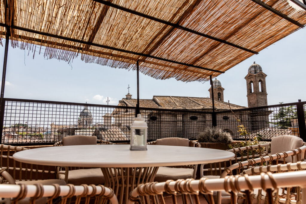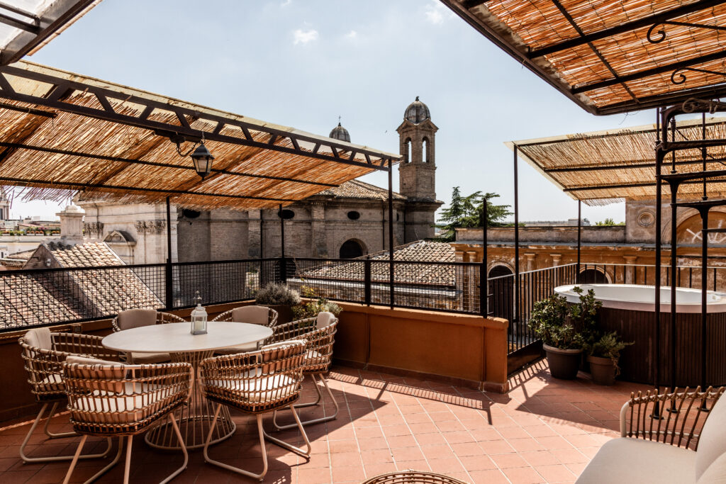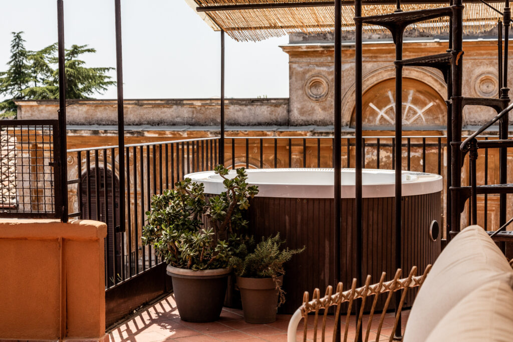 La vera sorpresa attende all’aperto. La terrazza, che si sviluppa come un prolungamento naturale del soggiorno, è un piccolo paradiso urbano. Qui, un divano accoglie le serate estive, mentre un grande tavolo invita a cene lente, illuminate dal bagliore caldo delle lanterne. In un angolo, la vasca idromassaggio diventa un luogo di contemplazione: immergersi nell’acqua tiepida mentre il sole tramonta dietro le cupole è un’esperienza che appartiene solo a questa casa. Completa lo spazio un solarium, perfetto per un momento di lettura o un pranzo sotto il cielo di Roma.