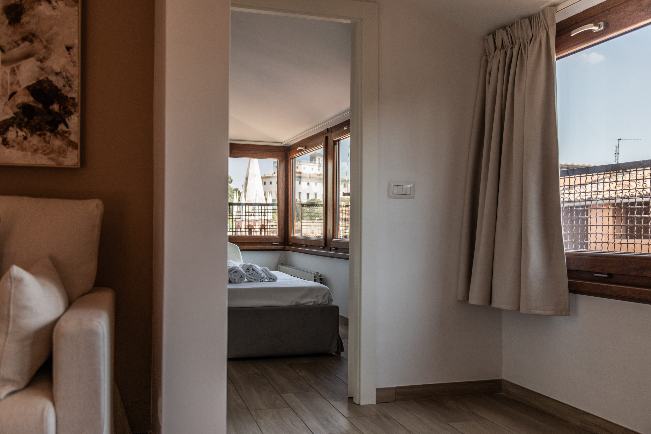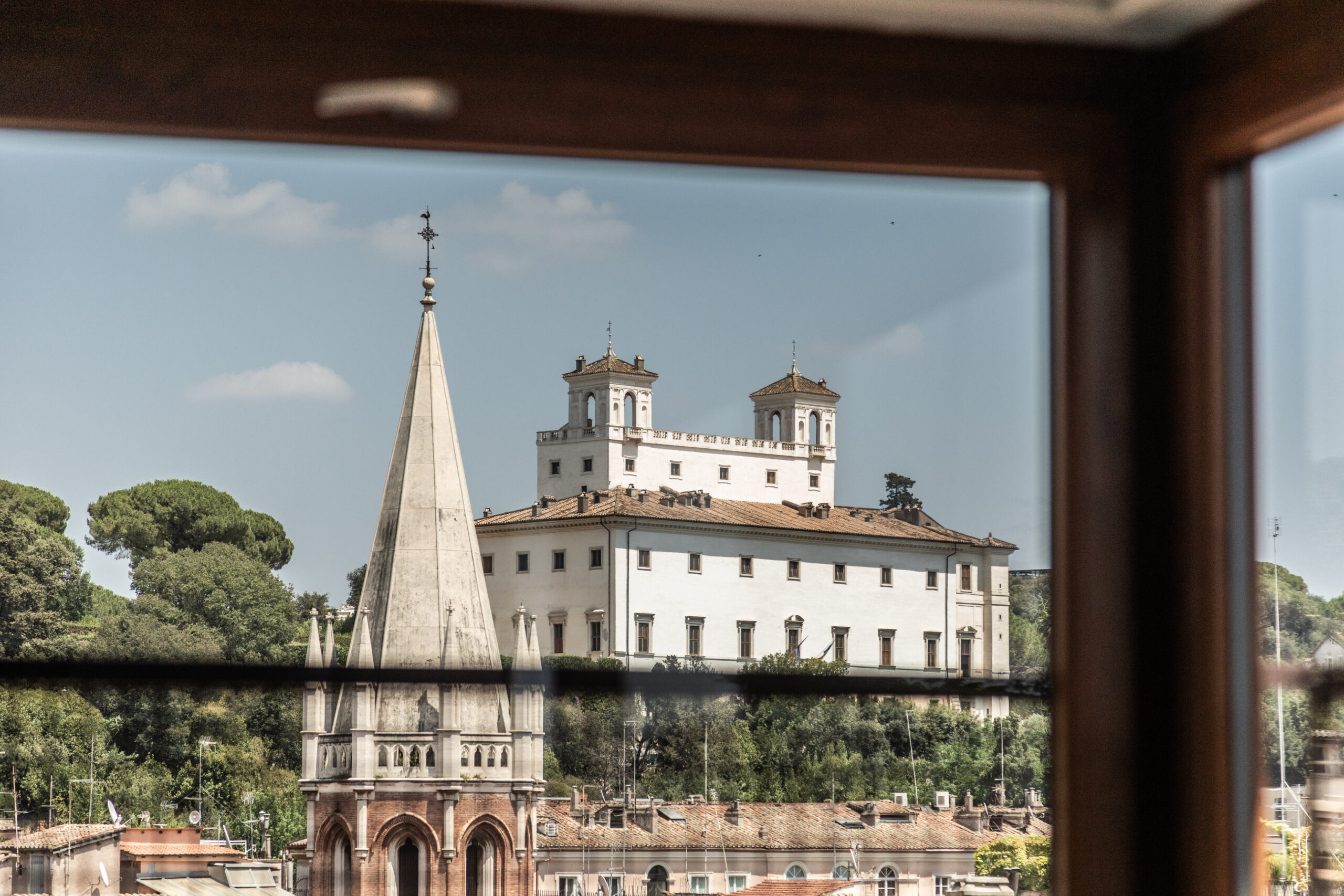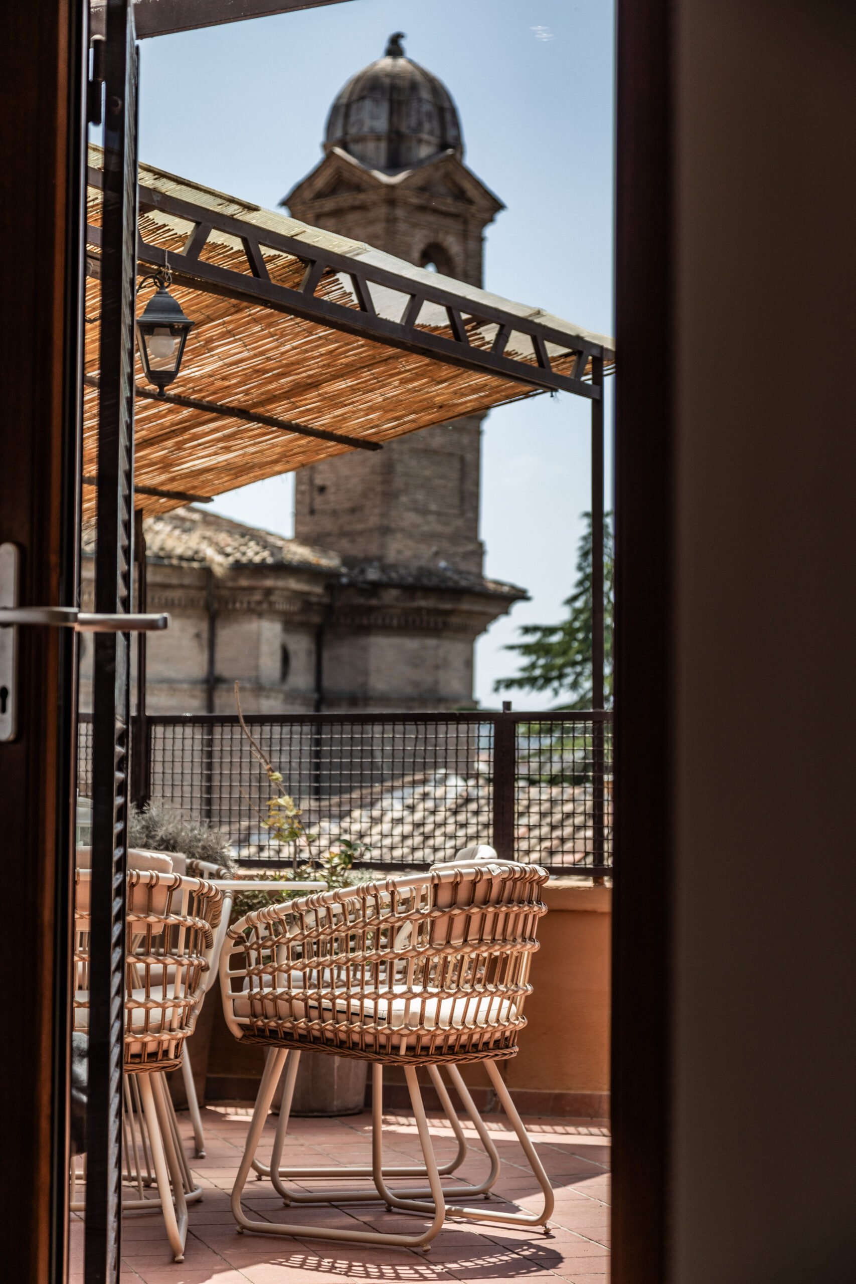 Le cupole, i campanili, le facciate color miele e, più in là, la perfezione scenografica di Piazza del Popolo: qui, sospeso tra cielo e città, il tempo sembra dilatarsi. L’interno, progettato con una sensibilità contemporanea e misurata, riflette la stessa eleganza spontanea che si respira all’esterno. I toni neutri e le superfici naturali disegnano un paesaggio domestico calmo, raffinato, quasi silenzioso.
